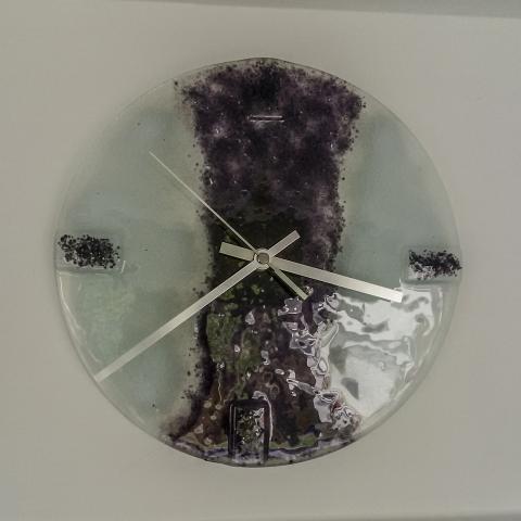 Handmade fused glass wall clock designed by Karen - 12" diameter. This matches wall lights designed and made jointly with glassmaker Eva Edery for Karen's home in 2013. Prices from £110. Commissions can be taken in various designs, modern shapes and colours with sizes from 10" diameter.